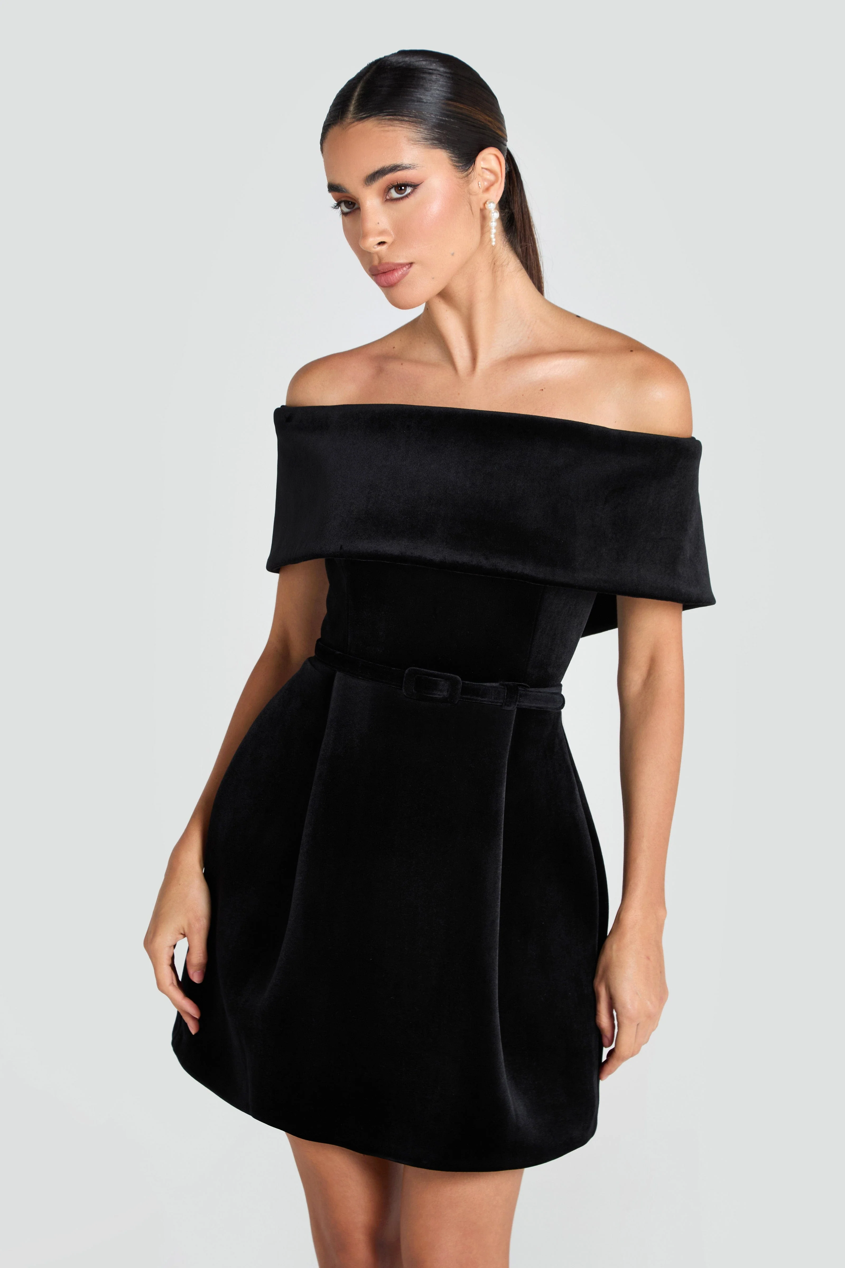 CARMEN is an off-the-shoulder mini dress, crafted from exclusively designed black velvet with a structured pleat-detailed skirt with pockets, a detachable black velvet belt, and a concealed zip closure to the back.