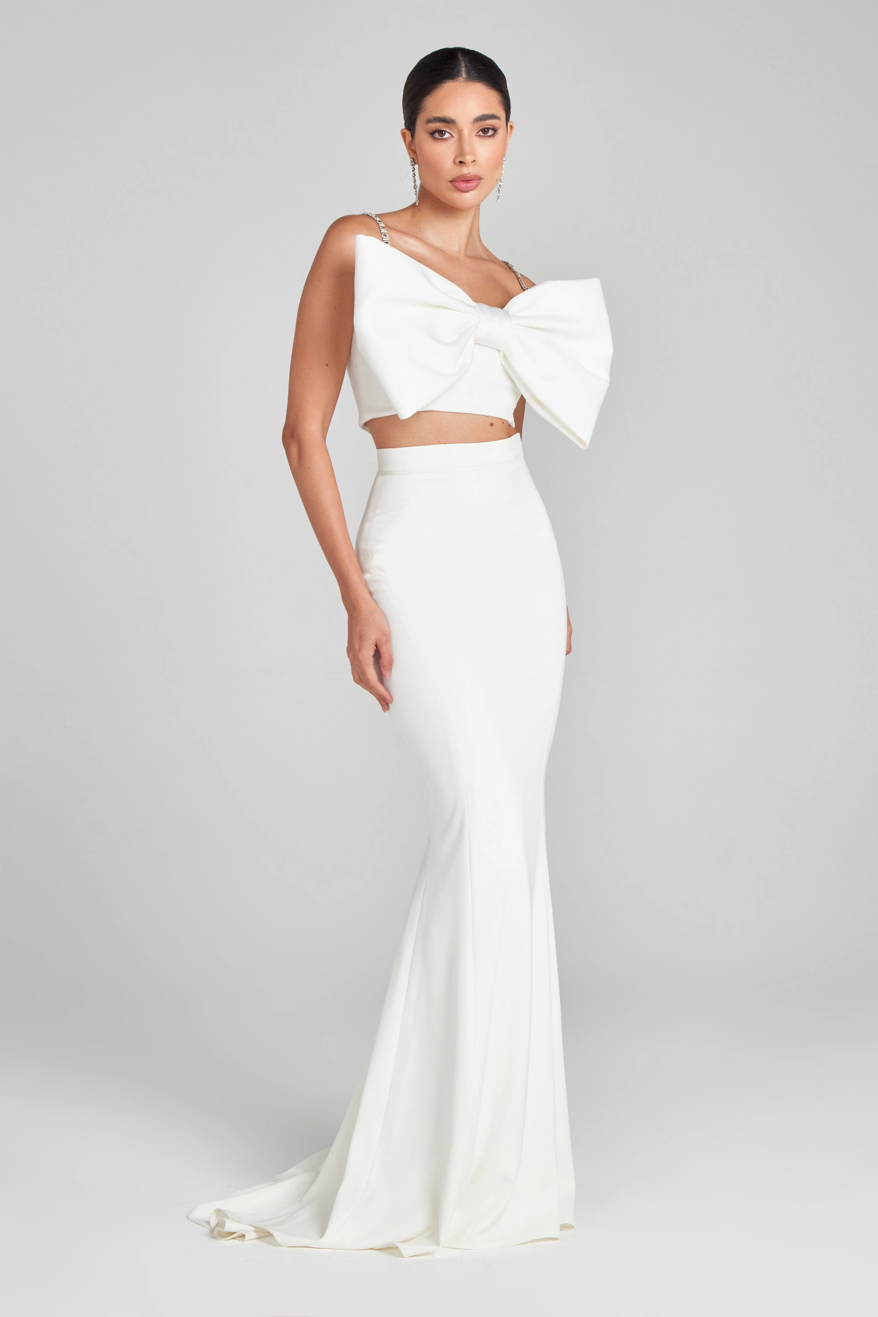ISOBEL is an eye-catching white bandeau style top, crafted from our signature crepe fabric, featuring a statement structured satin bow. This stand out design features boning to the front back and sides, panel detailing to contour the bust and silicone taping to hold you in place. Finished with an exposed zip closure to the back and is fully lined for a smooth fit. This style comes with jewel-embellished detachable straps.