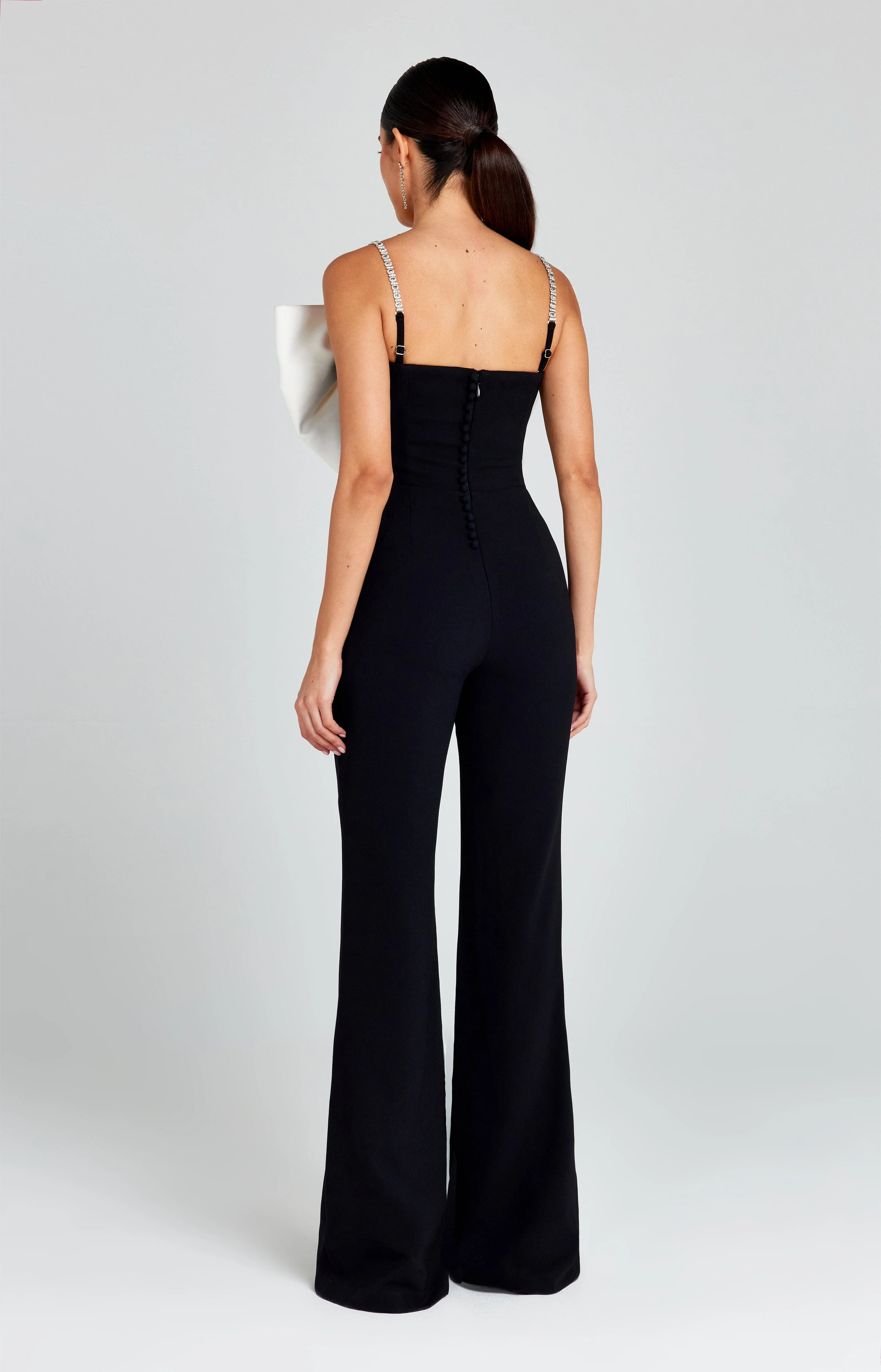 JENNY is a head-turning monochrome jumpsuit crafted from black crepe fabric with a large, statement structured white satin bow appliqué, the centrepiece of the style. This design features diamanté detailed straps, corset boning to the front, back, and sides of the bodice, a full-length flared trouser, non-functional button detailing at the back, and a concealed zip closure. Finished fully lined in satin for a smooth fit.