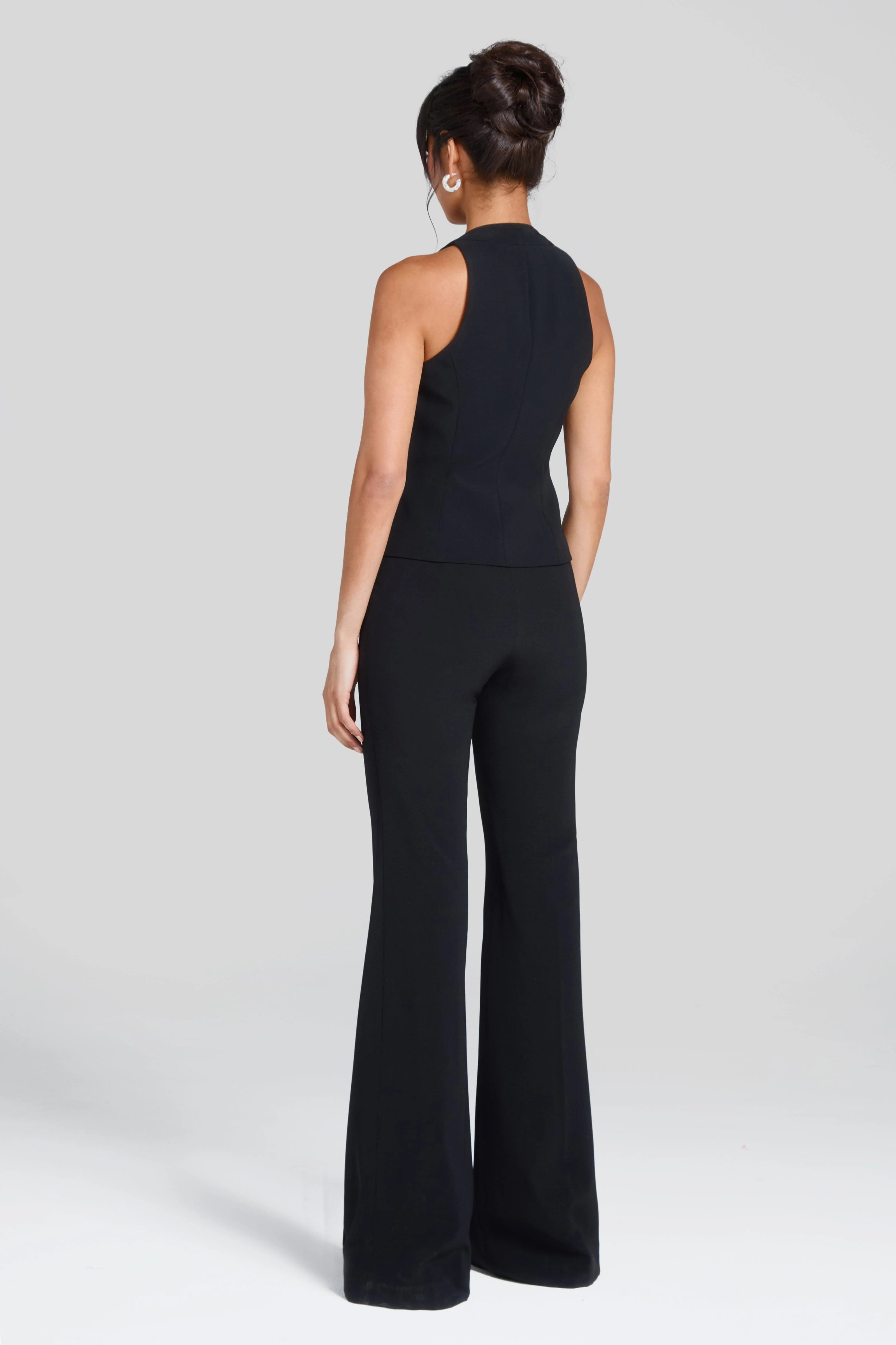 LENI is a figure-flattering single-breasted tailored waistcoat crafted from our exclusive black crepe fabric, featuring non-functional pockets, silhouette-enhancing seam detailing, and is finished with five-button fastenings.