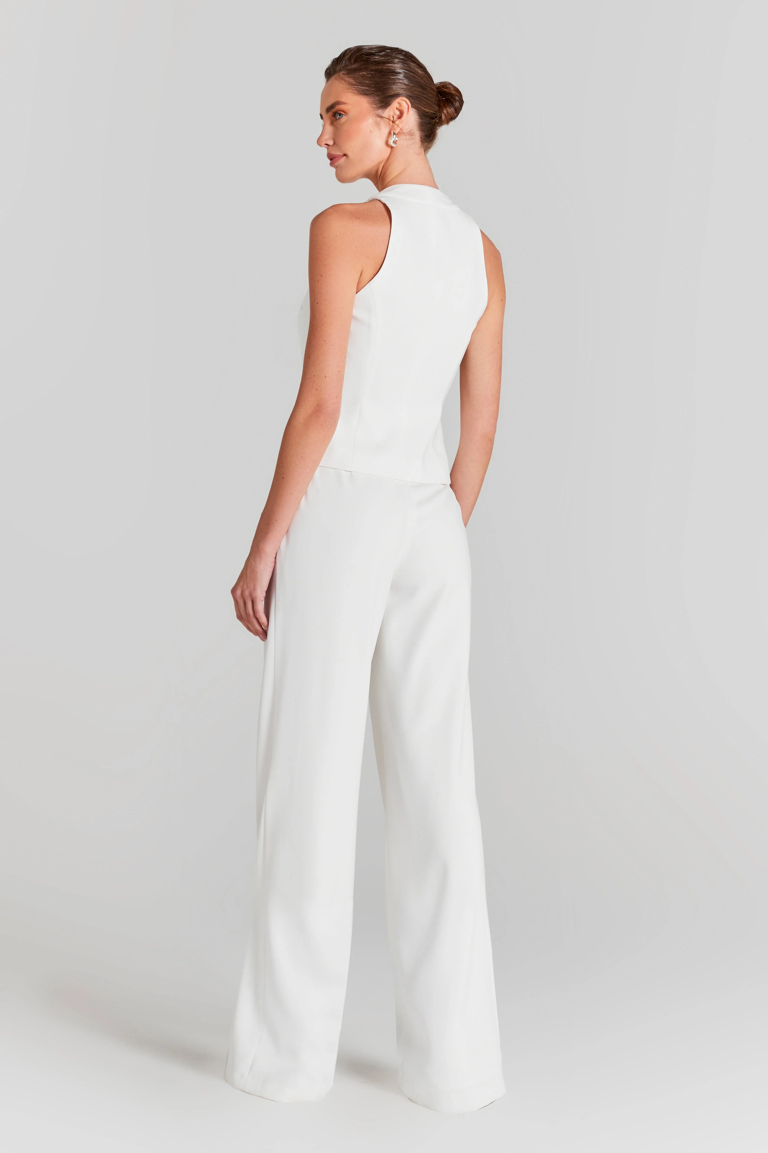 LENI is a figure-flattering single-breasted tailored waistcoat crafted from our exclusive white crepe fabric, featuring non-functional pockets, silhouette-enhancing seam detailing, and is finished with five-button fastenings.