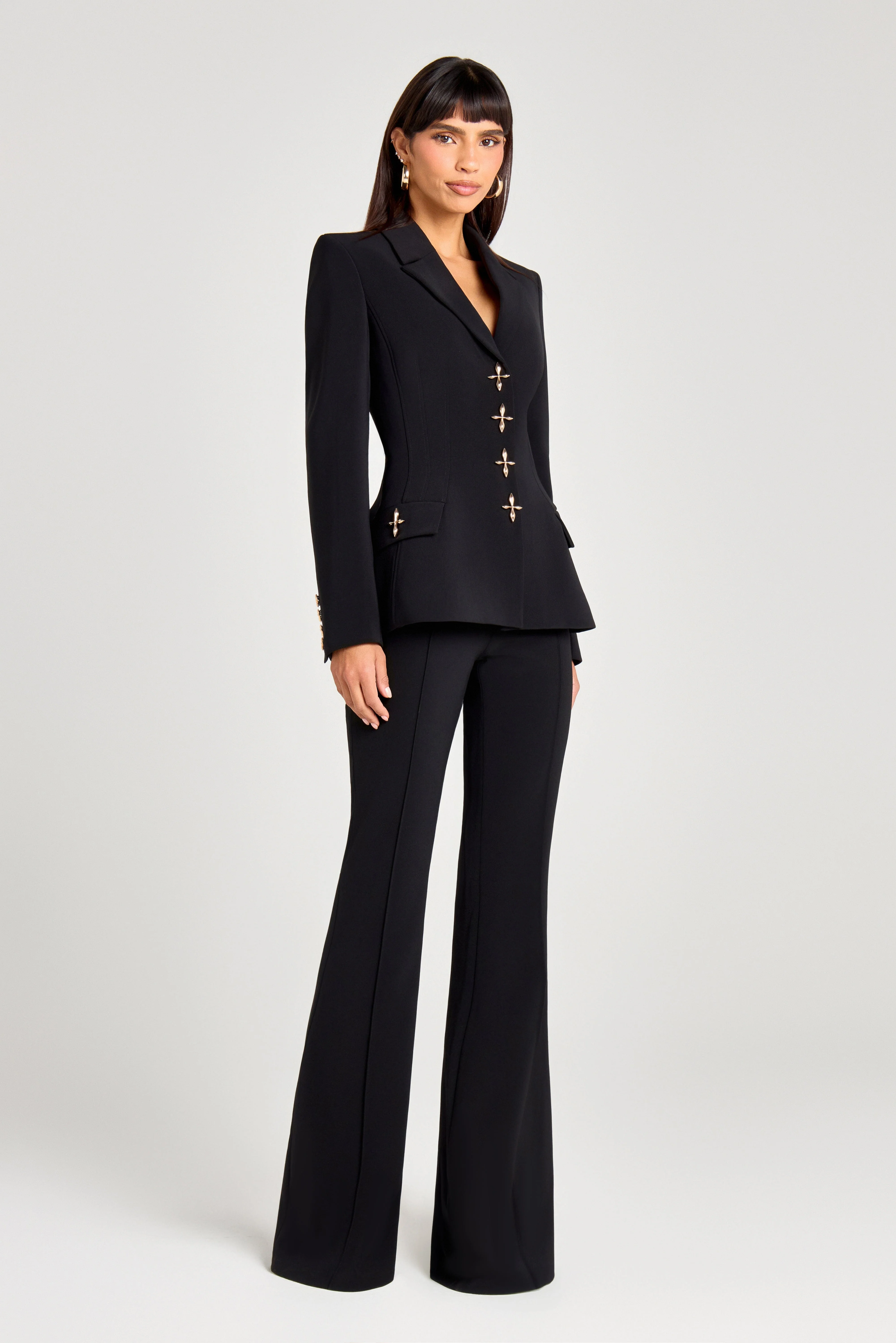 MERABI’s answer to modern tailoring. The NICOLA Black Blazer is crafted from our signature crepe fabric and fully lined in satin for a smooth, refined fit. Designed with a cinched waist and padded shoulders for structure, this blazer features exposed seam detailing through the front and back for a sculpted, contemporary finish. Complete with statement cross-detail snap fastenings at the front and non-functional cross buttons at the cuffs. Complete the look and style with CHARLOTTE Black Trousers.