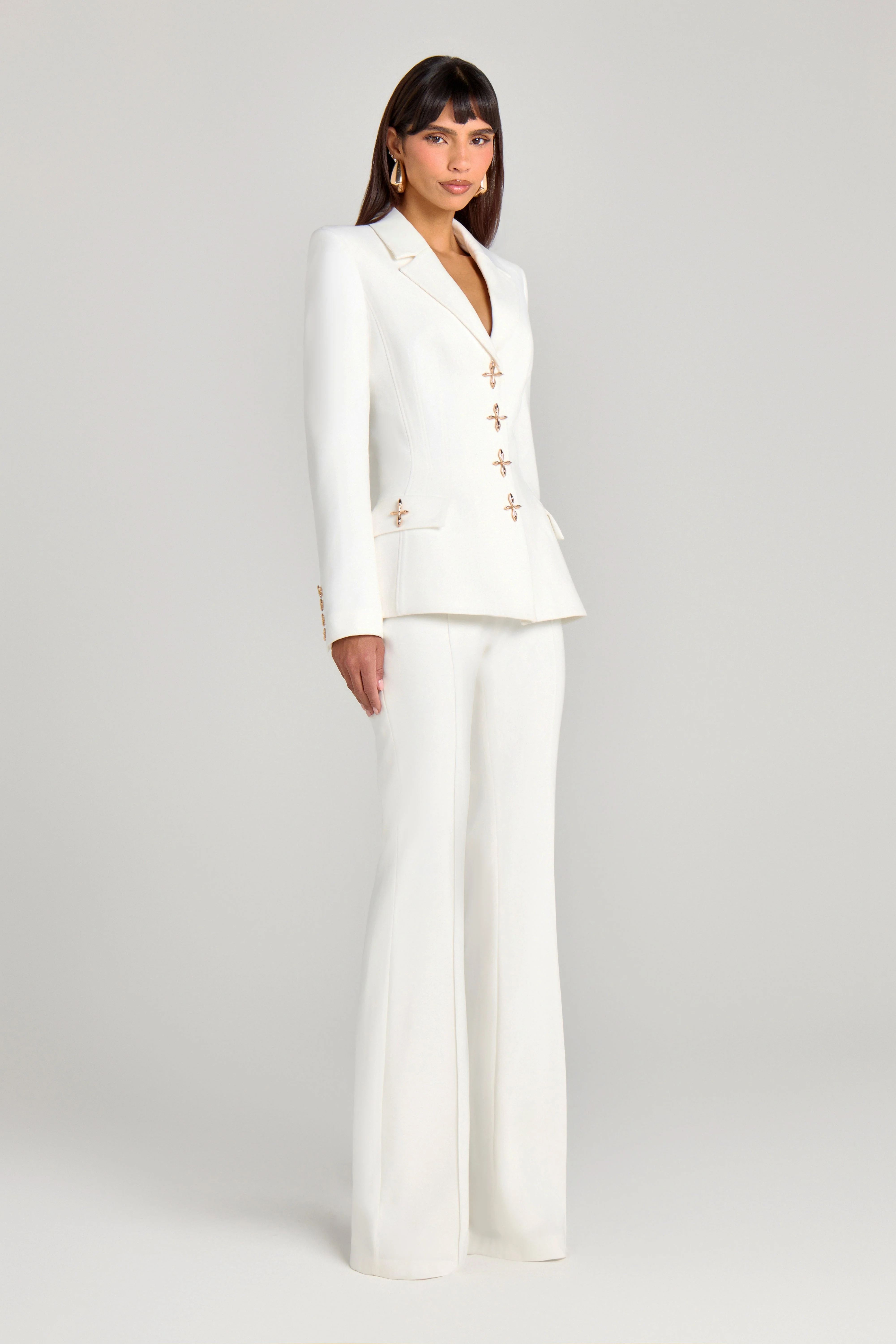 MERABI’s answer to modern tailoring. The NICOLA White Blazer is crafted from our signature crepe fabric and fully lined in satin for a smooth, refined fit. Designed with a cinched waist and padded shoulders for structure, this blazer features exposed seam detailing through the front and back for a sculpted, contemporary finish. Complete with statement cross-detail snap fastenings at the front and non-functional cross buttons at the cuffs. Complete the look and style with CHARLOTTE White Trousers.