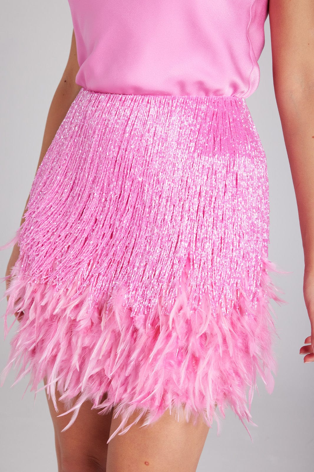 The SARA Pink Skirt is worn to make an impact, individually hand embellished with crystal waterfall beading and feather tips. This stunning skirt will accentuate your curves and flatter your figure.